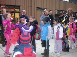 Anprobe des Kostuems! Vor der Schule hatten sich alle in ihren Kostuemen versammelt. Alle waren wunderbar verkleidet. Dann kam die Lehrerin als Katze die Kinder einlassen.